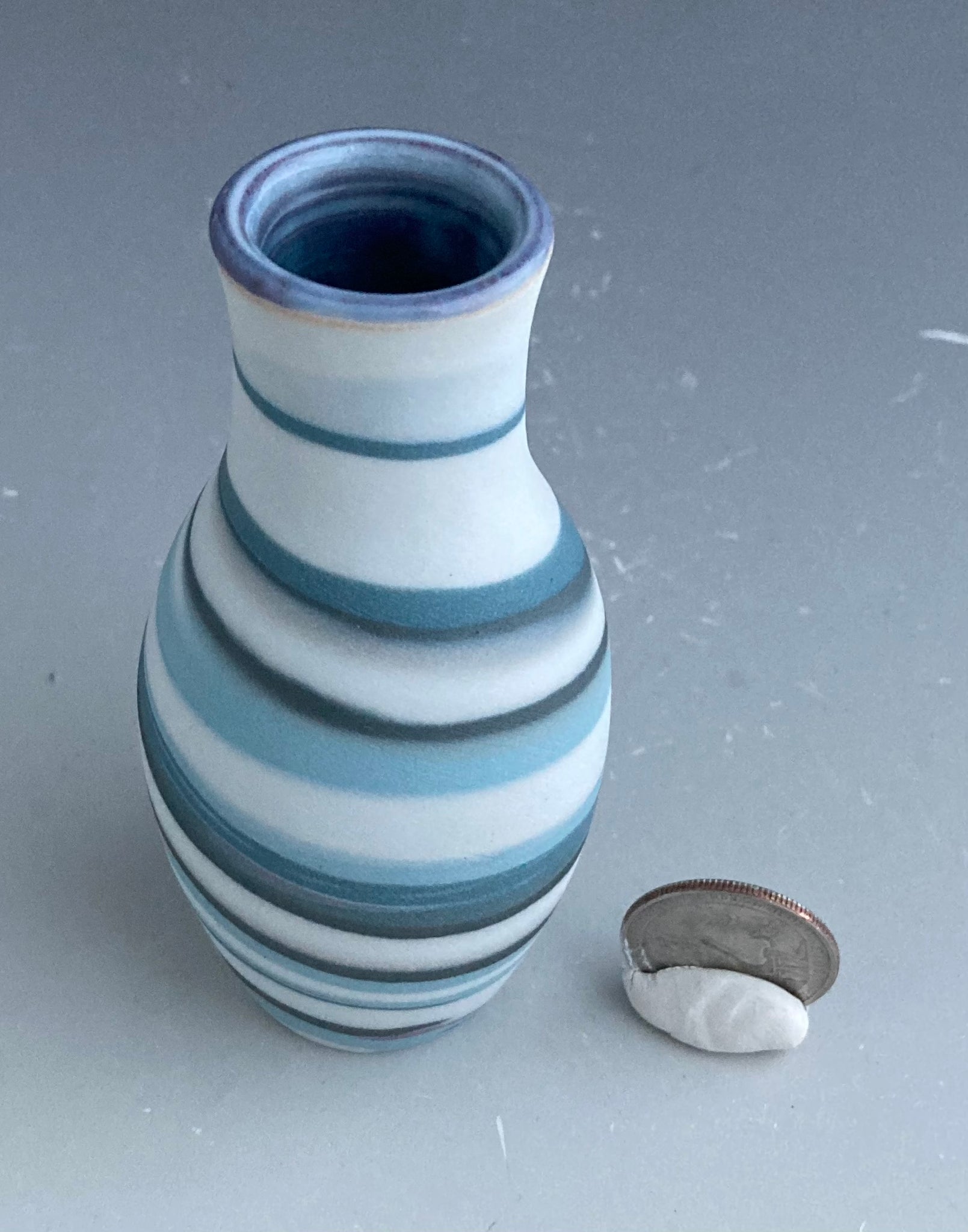 Miniature bud vase great for a windowsill or shelf. Can be used for fresh cut or faux flowers or greens. (Note: quarter for size reference only, not included). Approx 4.5” tall