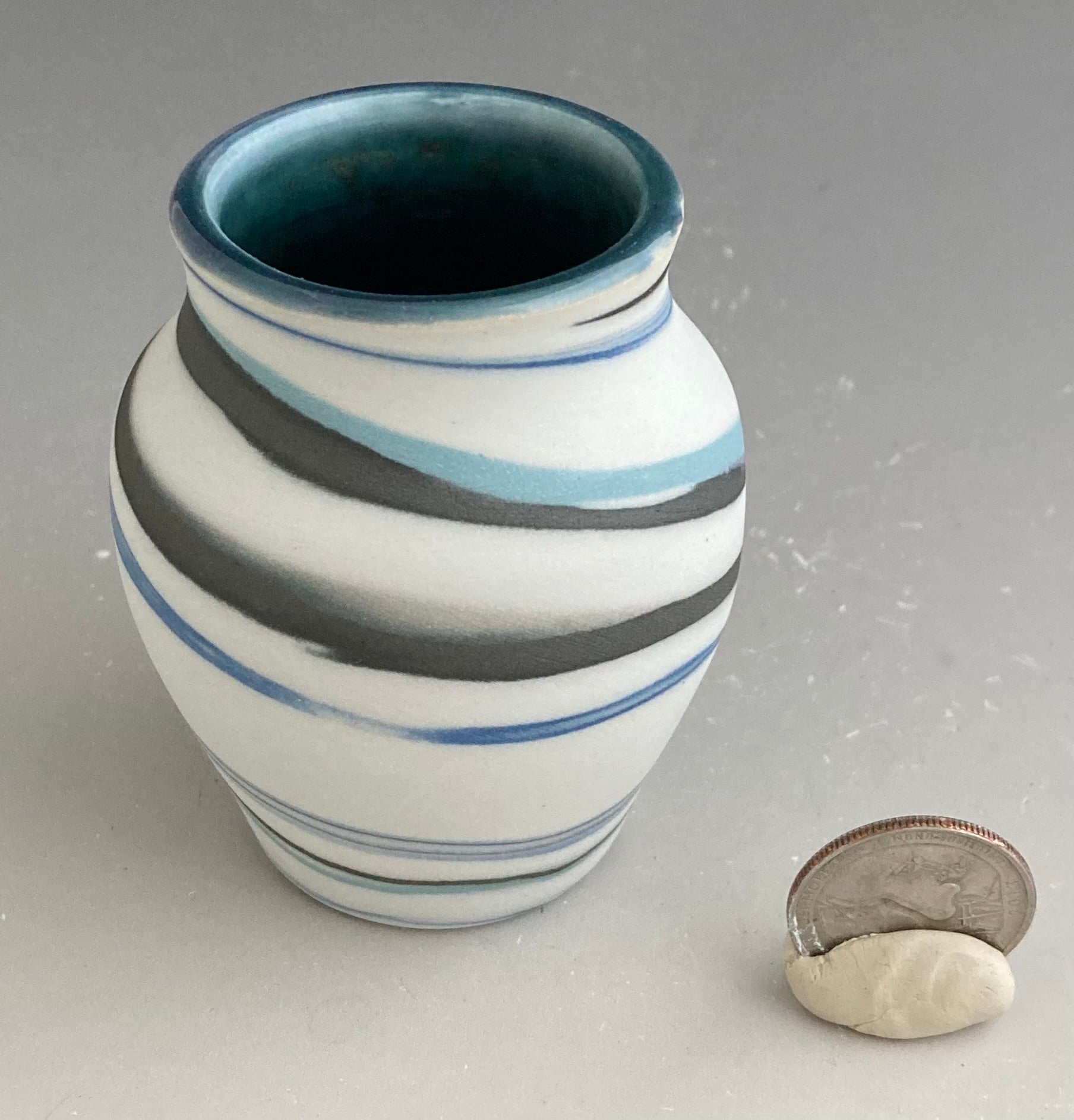 Miniature bud vase great for a windowsill or shelf. Can be used for fresh cut or faux flowers or greens. (Note: quarter for size reference only, not included). Approx 3”  tall