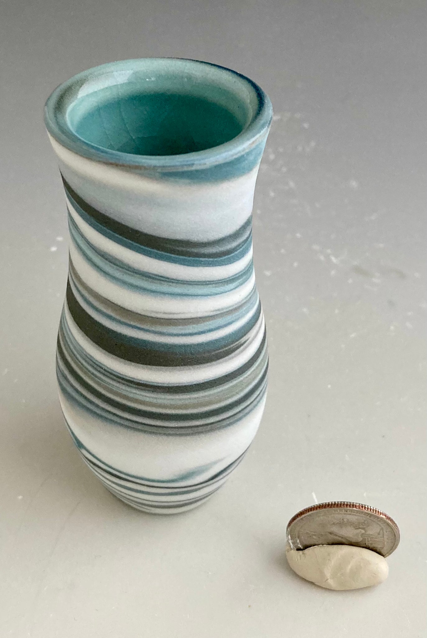 Miniature bud vase great for a windowsill or shelf. Can be used for fresh cut or faux flowers or greens. (Note: quarter for size reference only, not included). Approx 4”  tall