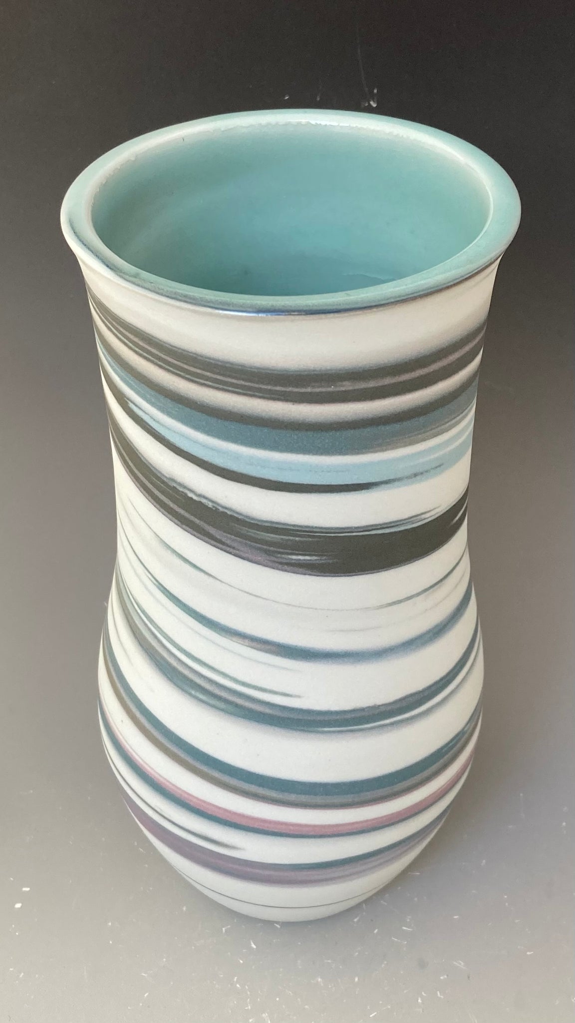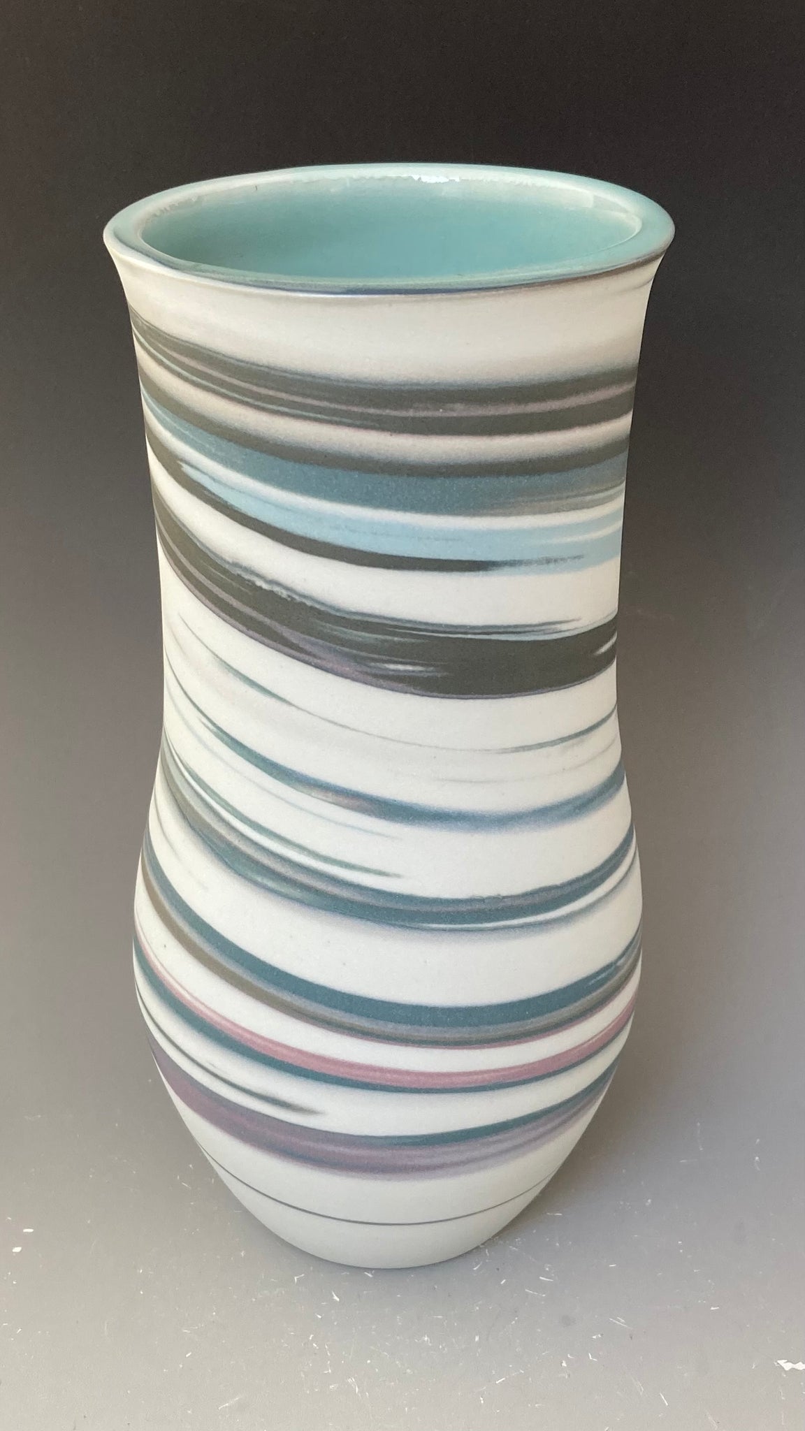 Wheel-thrown marbled porcelain vase, unglazed and polished smooth on the exterior, glazed in light blue on the interior. Can be used for flowers or decoratively.
