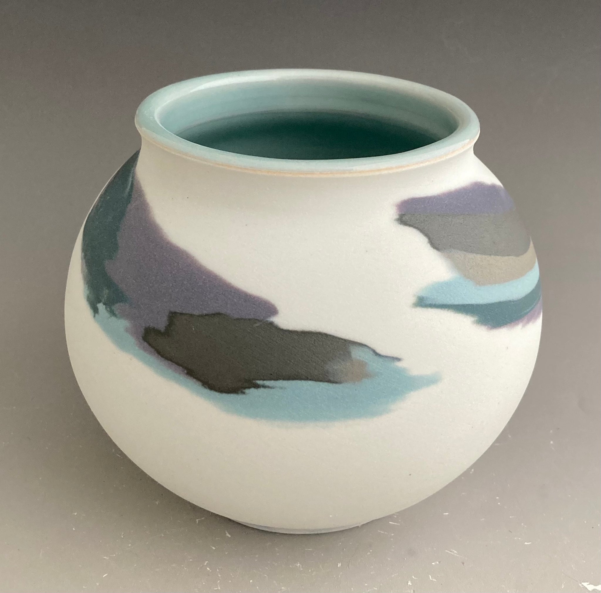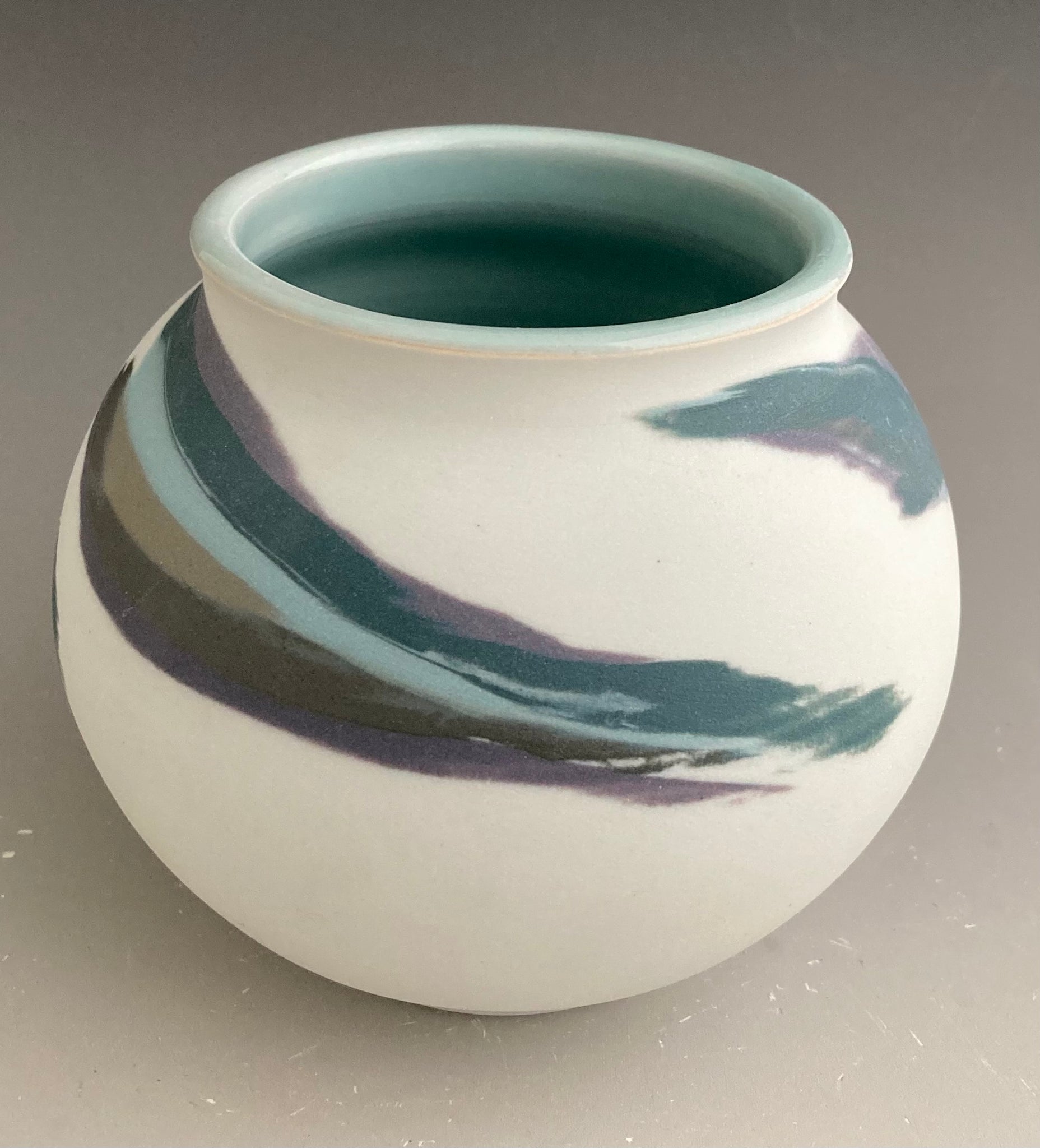Wheel-thrown round vase with a twist of black, blue, teal, purple and gray on white porcelain. Unglazed and polished smooth on the exterior, glazed in light blue green on the interior.