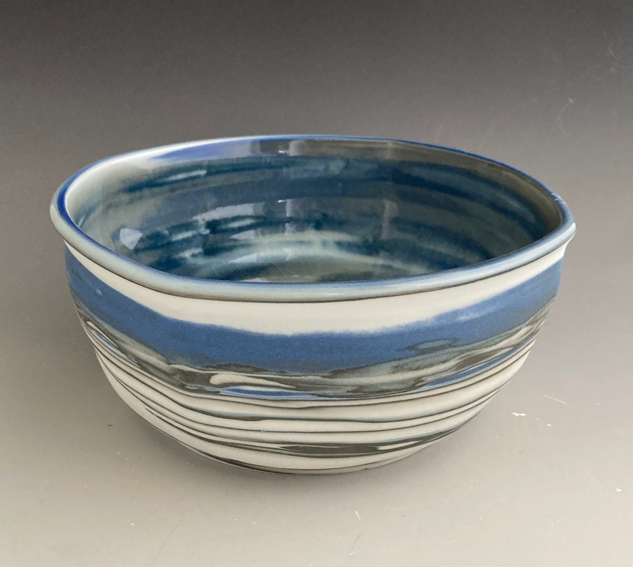 Wheel-thrown, squared off and carved marbled porcelain serving bowl. Unglazed and textured on the exterior, glazed in clear on the interior. Can be used in microwave, oven and dishwasher or decoratively for home decor. Makes a beautiful kitchen table, dining table or island centerpiece.